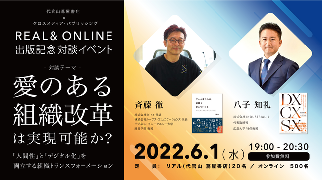 本イベントでは、5万部を超えるベストセラー『だから僕たちは、組織を変えていける』の著者 斉藤徹氏と、新著『DX CX SX』の著者 八子知礼の二人が「人間性とデジタルの両立」をテーマとして対談いたします。