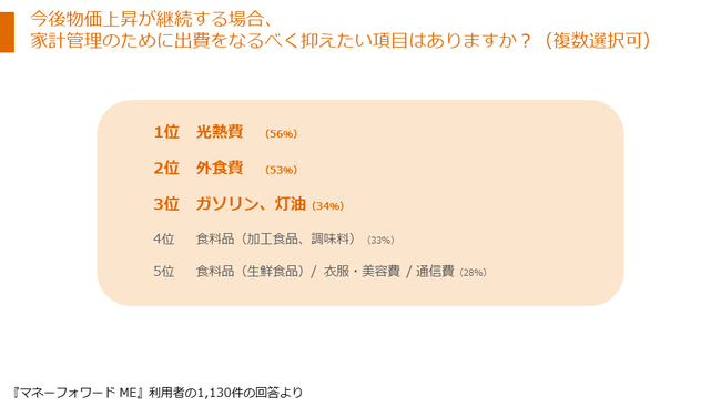 今後も物価上昇が継続していく場合、家計管理のために出費をなるべく抑えたいと考えている項目については、1位「光熱費(56%)」、2位「外食費(53%)」、3位「ガソリン、灯油(34%)」が挙がり、その他に5位「通信費(28%)」なども、今後出費を抑えたい項目として挙がりました。