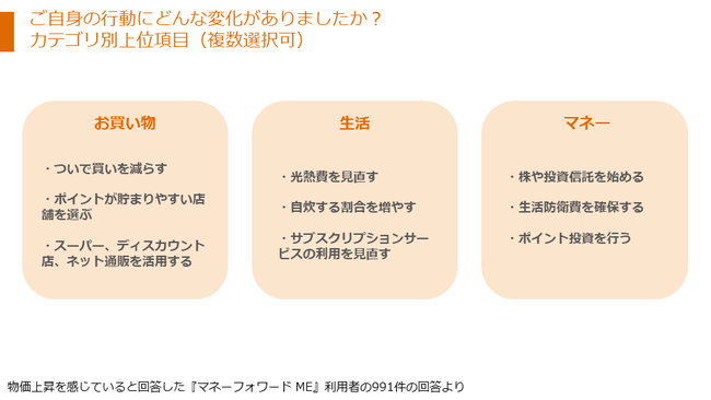 また、回答を「お買い物」「生活」「マネー」の3つのカテゴリ別でみると、「自炊する割合を増やす」「サブスクリプションサービスの利用を見直す」「ポイント投資を行う」なども行動の変化として上位に挙がりました。