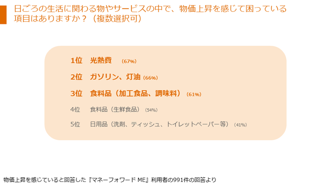 値上げで困ったのは「光熱費」「ガソリン、灯油」「食料品(加工食品、調味料)」の3項目