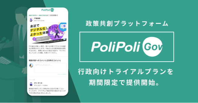 株式会社PoliPoli(所在地:神奈川県鎌倉市、代表取締役:伊藤和真、以下 PoliPoli)は、『PoliPoli Gov(β版)』行政向け政策共創プラットフォームにおいて、PoliPoli Govトライアルプランの提供を開始することをお知らせいたします。