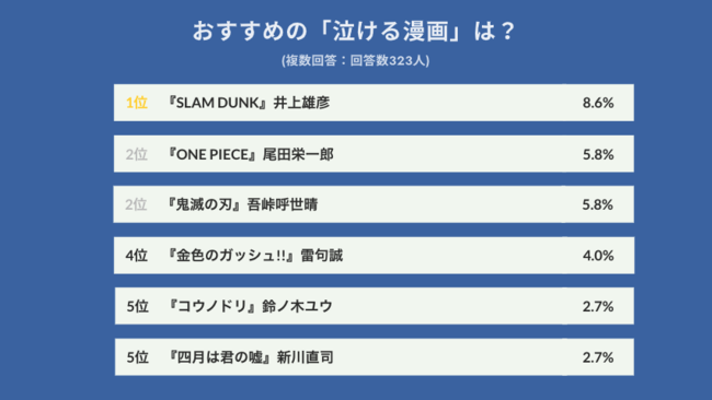 他にも『ONE PIECE』『鬼滅の刃』『金色のガッシュ!!』『コウノドリ』『四月は君の嘘』がランクイン。泣ける理由も、悲しい展開だけでなく、泥臭い友情や主人公の成長過程など、作品によってさまざま。あなたの好きな作品は入っていましたか?