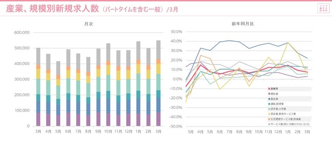 新規求人数は、前年比で7.5%増とやや改善しました。伸び率が高い産業のトップ3は、製造業(22.0%増)、情報通信業(16.9%増)、運輸業,郵便業(12.6%増)などで増加となり、教育,学習支援業(1.6%減)は減少しました。コロナ禍に直撃された宿泊業,飲食サービス業が、1月2月と伸び率トップとなりましたが、今月は5.0%の伸長。