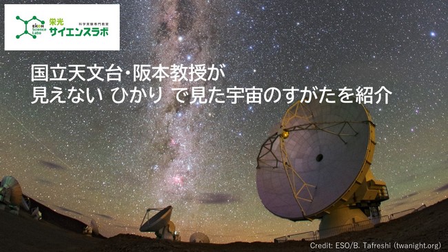 株式会社増進会ホールディングス(Z会グループ)のグループ会社で、進学塾「栄光ゼミナール」を運営する株式会社栄光(本社:東京都千代田区、代表取締役社長:下田勝昭)は、科学実験専門教室「栄光サイエンスラボ」において第一線で活躍する研究者が講師をつとめる「スペシャリスト講座」をオンラインライブ形式で開催しています。6月19日(日)には、小学1年生以上を対象に、国立天文台アルマプロジェクト 教授・阪本成一氏を講師に迎え、世界最高性能の電波望遠鏡「アルマ望遠鏡」で見た宇宙のすがたや最新の研究成果を分かりやすく解説します。