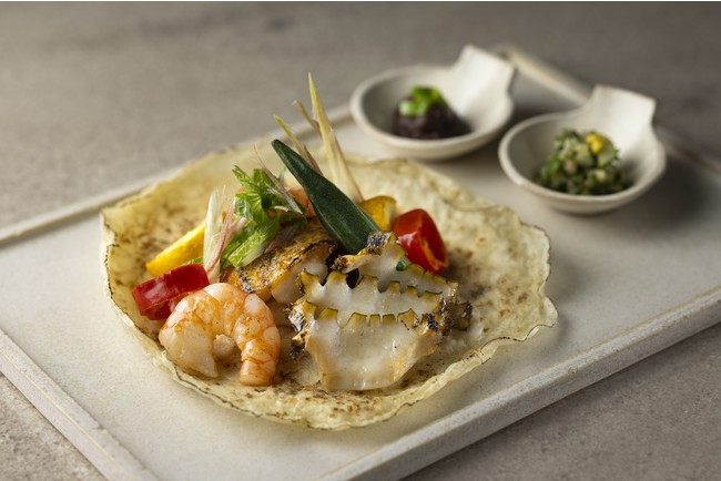 山形県、庄内浜で水揚げされた「のどぐろ」、鮑と夏野菜のソテー、米粉を使ったガレット仕立て -「南蛮味噌」、山形県郷土料理「だし」とともに-
