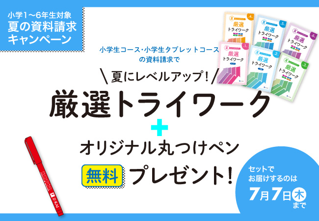 株式会社増進会ホールディングス(Z会グループ)のグループ会社である株式会社Z会は、「Z会の通信教育」において、小学生向けコースの資料をご請求いただいた方に、解きごたえのある問題を収録した学年別『厳選トライワーク』を無料でプレゼントするキャンペーンを、5月20日(金)から8月31日(水)まで実施中です。さらに、7月7日(木)までのご請求で、Z会オリジナル丸付けペンも無料プレゼント。ぜひこの機会にお申し込みください。