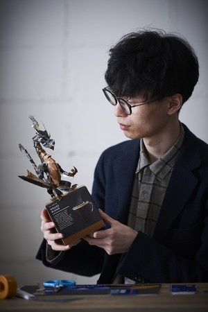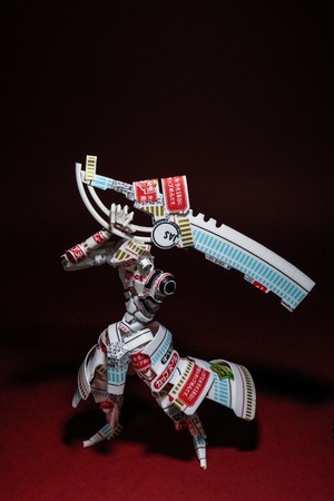 発売50周年を記念して限定発売された「カップヌードル スーパー合体シリーズ」を近未来的な質感を生かした合体サイボーグに。発表されるやいなや、他の合体シリーズ3作品とともに話題となりました。カップヌードルの容器の内側は接着剤を弾く材質のため、カッターで傷をつけて接着剤を浸透させたり、表面の素材だけ剥がしたりと、加工に苦労した作品です。