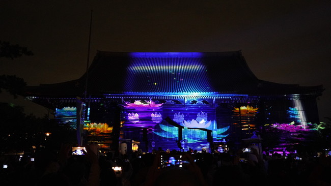 親鸞生誕850年1年前記念事業。幅約42メートル、高さ約25mの巨大な国宝木造建築物・御影堂に極彩色の鳥や蓮など専修寺が誇る文化財や象徴をモチーフとしたデジタルアートコンテンツを投影。