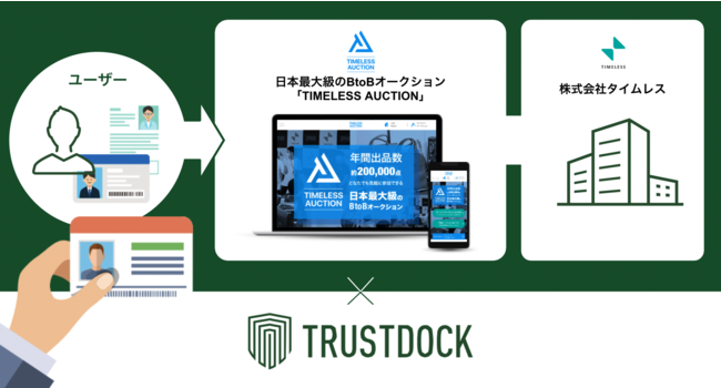 導入社数No.1(※)のオンライン本人確認/eKYCを提供する株式会社TRUSTDOCK(本社:東京都千代田区、代表取締役:千葉 孝浩、以下 TRUSTDOCK)と株式会社タイムレス(本社:東京都港区、代表取締役:太田 大哉、以下 タイムレス)は、本人確認業務の代行において業務提携することに合意し、タイムレスが展開する、日本最大級のBtoBオークション「TIMELESS AUCTION」に、本人確認APIの導入実施を完了したことをご報告します。