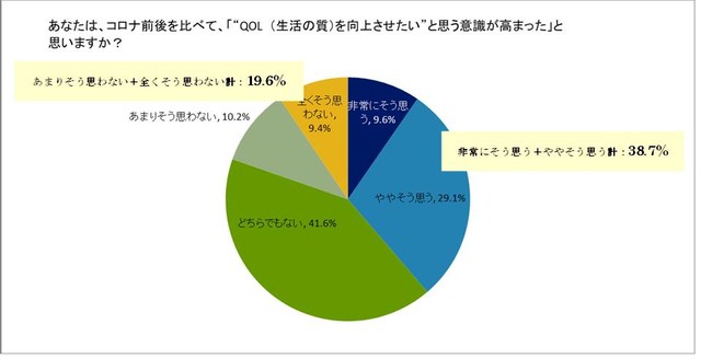 コロナ前後を比べ、「QOL(生活の質)を向上させたいと思う意識が高まった」と思っている人は、38.7%。