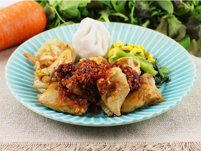 よだれ鶏のリニューアルです。痺れと辛味が物足りないとのお声をいただき、パワーアップして帰ってきました。食べやすい大きさにカットした鶏もも肉に、ラー油、乾燥玉ねぎ、花椒粉等を合わせた、ザクザク食感のラー油ソースは、シビ辛度がアップしております。