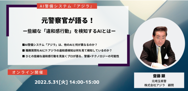 アジラ、5月31日(火) 無料オンラインセミナー『元警察官が語る! 施設向けAI警備システム「アジラ」』を開催