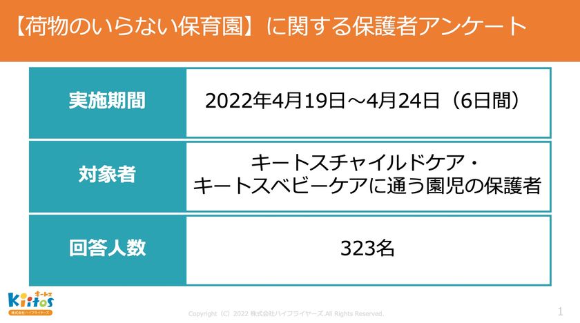 株式会社ハイフライヤーズ( https://www.kiitos-kids.net 本社:千葉県千葉市、代表取締役:日向 高志、以下 ハイフライヤーズ)は認可保育園でありながら園で使用する荷物を持ち込み不要とする「荷物のいらない保育園」の実施を2022年1月17日より開始しています。布団やオムツ、歯ブラシ、食事用エプロンなど、保護者の金銭負担も無く毎日の通園準備から解放されることで子どもと保護者が向き合う時間を増やすことを目指しています。