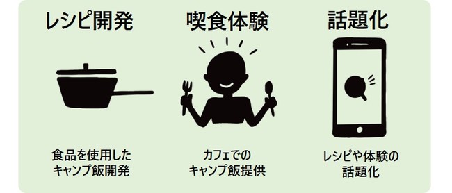 同プランでは、食品メーカーなどの食品や食材のキャンプシーンでの食べ方やレシピをソトレシピが企画し、そのレシピをもとにREWILD OUTDOOR TOKYOがカフェメニューとして提供します。そしてそのレシピや、カフェと食品メーカーのコラボレーションに関する情報発信、キャンペーンを使ったSNS投稿などによる企画の話題化までをサポートします。