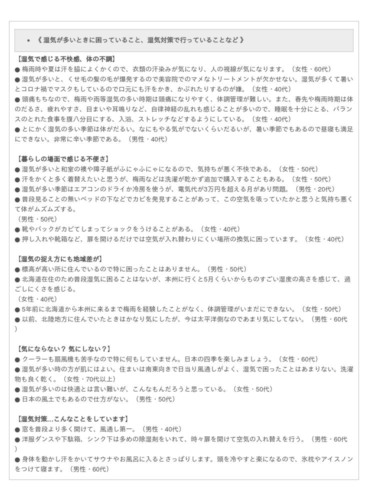 最後に、湿気について困っていることや対策で行っていることなど自由に書いてもらいました。湿気で困ることとして多くの人が挙げたのが「洗濯」。乾燥機を完備している家庭が増えているとはいえ、“晴れ間に洗濯しようにもタイミングが合わない” “部屋干しの洗濯物にサーキュレーターで風を当てて乾かした”などは、誰しも経験したことがあるでしょう。また「だるい」「やる気がでない」「気分が上がらない」といった湿気が心身面に及ぼす影響も多くの声がありました。その一方で「気にならない」という人も一定数おり、もはや“諦観の境地”ともいえる声も。これからの季節、湿度対策を施してうまく付き合いながら乗り切っていきましょう。