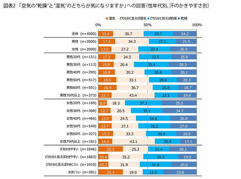【空気の乾燥と湿気のどちらが気になるか】もたずねたところ(図表2)、「湿気」(「どちらかと言えば」を含む)46.1%、「乾燥」(同)53.9%と、乾燥が気になる人のほうが若干多い結果に。性別では、男性は半数超が「湿気」、女性は6割近くが「乾燥」と差が。女性は“乾燥はお肌の大敵”と考える人が多いのでしょう。性年代別では、男女とも年代が上がるほど「湿気」が気になる傾向がみられ、男性50代以上、女性は70代以上では過半数に。汗のかきやすさ別では“かきにくい”人の25%が「湿気」と回答。汗が出にくい体質だと“熱が体にこもってしまうので湿気が気になる”というのもあるのかもしれません。