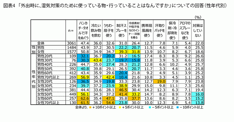さらに性年代別で細かくみてみると、「冷たい飲み物」は30代男性が43.4%と突出しているものの、各年代で30%台と安定的な支持を集めました。「汗をぬぐう」と「うちわ・扇子」は高齢層、なかでも60代以上の女性で高値となりました。これ以下の年代だと、「制汗スプレー」は30~50代、「冷感素材や吸汗性などのインナー・洋服」は50~60代のいずれも女性が主力層に。また全体では7位・7.8%にとどまる「汗取りパッド」ですが、女性の1割、特に20代は19%、また40代と70代以上でも12%台と、全年代で1割前後の人が使っていました。