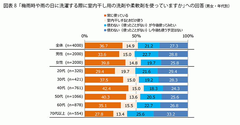 洗濯物を部屋干しすると、生乾きのにおいや雑菌が気になるもの。これらの解決策のひとつとして【室内干し用の洗剤や柔軟剤を使っているか】もたずねたところ(図表8)、最も多かったのが「常に使っている」36.7%。季節・天候に関わらず部屋干しをする人も多いのかもしれませんね。また、「室内干しするときだけ」の“使い分け派”も15%、「使わない(使っていない)が今後使ってみたい」と興味を示す人も2割強にのぼりました。年代別では、「常に」派が30代以下の若年層より40代・50代で高値を示しているのは興味があるところです。一方で「今後も使う予定はない」としたのは、保守的な考えからか70代以上が33.2%と最多であるほか、20代も29.4%と高値なのが少し意外ですね。