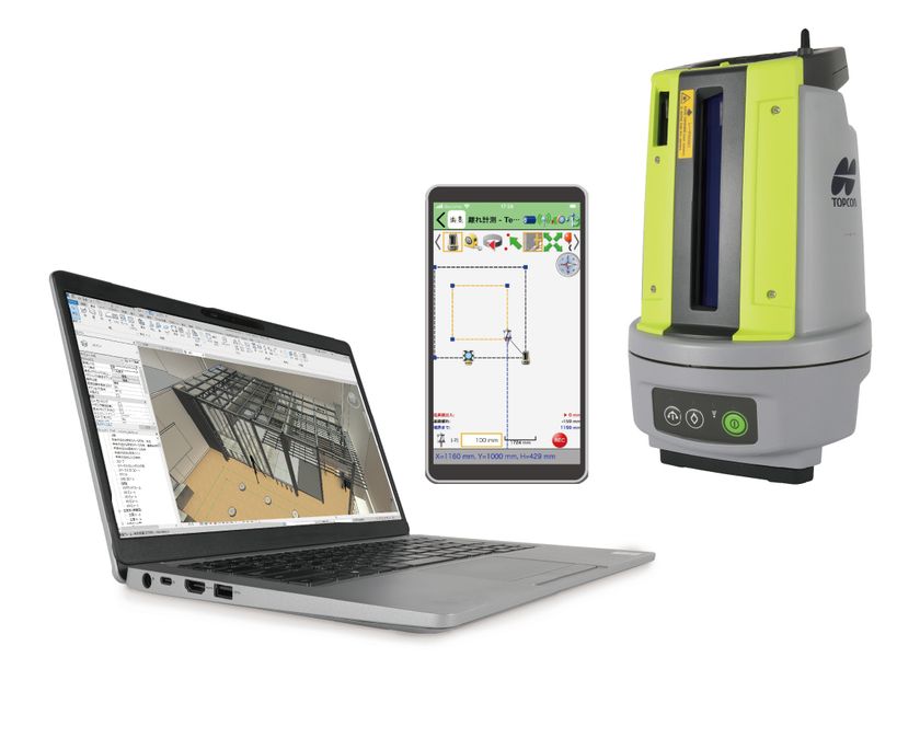 高精度位置出し機『楽位置』(らくいち)と、スマホ用建築現場向けワンマン位置出し誘導アプリケーションソフトウエア『楽墨』(らくずみ)による「建築施工向けのワンマン位置出しシステム」は、技能者不足に課題を抱える施工現場において、誰でも、1人で、簡単に位置出しや検査を行えることにより、作業者の人員削減と作業時間の短縮に大きな効果があると、発売以来ご好評をいただいております。