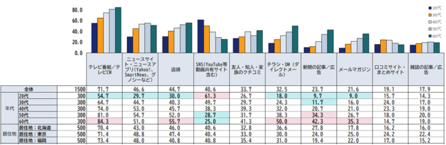 新しい商品やサービスを知る情報源について、居住地による大きな差は見られませんでした。一方で、年代による差は顕著です。年代の低い層ほどSNSでの情報収集が盛んです。他方、年代の高い層ほど、テレビ、店頭・チラシ・DM、新聞の記事・広告、メールマガジンから情報を得ていることがわかります。