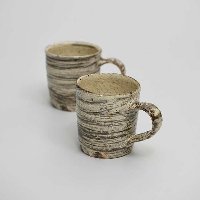 白樺刷毛目マグカップは工藤氏の作品群の中でも人気の高い器です。刷毛目で白樺の幹を表現し白樺の灰を釉薬に使った器は涼やかな北海道をイメージさせる、魅力的なマグカップです。