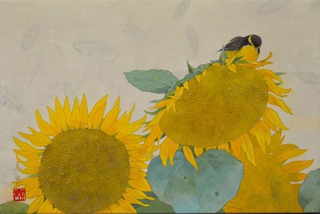 愛知芸大を卒業し、院展で活躍する若手作家 河本真里氏。植物と小動物を組み合わせた画面構成で独自の世界を創りあげています。丹念な取材とデッサンに裏打ちされた表現力と、淡い色彩の優しい作風が、観る者を魅了してやみません。
