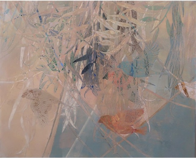柳の葉に包まれる空間とその中を飛ぶ小鳥たち。その心地良い風がそよぐ世界を描きたいと思い制作しました。