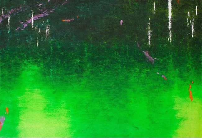 緑の水面が印象的な「水辺」のシリーズ、そして平安古筆の料紙の復興プロジェクトである「風力発電」の作品など20余点を展観いたします。繊細な感性により描かれる、水津氏ならではの静謐で透明感溢れる世界です。