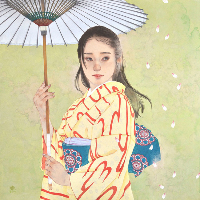 現代の浮世絵として、女性像が人気の作家。アートフェアなどでも活躍されています。特に和服姿は、色彩の鮮やかさと画面構成が新鮮です。