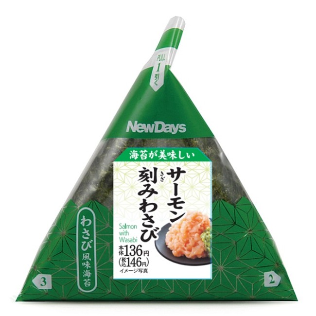 わさびの効いたサーモンのおにぎりに、さらにピリッと辛いわさび風味海苔を合わせたさわやかな味わいのおにぎりです。