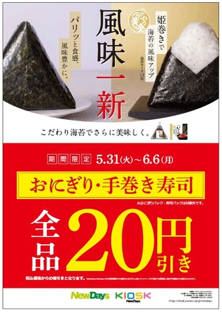 5月31日(火)から6月6日(月)の期間、NewDays・NewDays KIOSKではおにぎり・手巻き寿司を全品20円引きいたします。ぜひこの機会にご賞味ください。