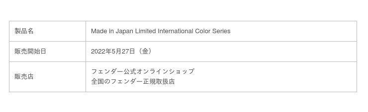 フェンダーミュージック株式会社(所在地:東京都渋谷区、代表取締役社長アジアパシフィック統括 エドワード・コール)は、フェンダーの日本製の新シリーズ『Made in Japan Limited International Color Series』を2022年5月27日(金)よりフェンダー公式オンラインショップおよび正規取扱店にて販売を開始します。