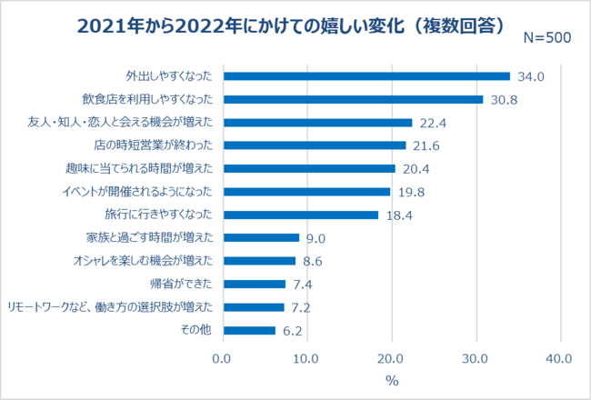 昨年から今年にかけての嬉しい変化「外出しやすくなった」「人と会える機会が増えた」