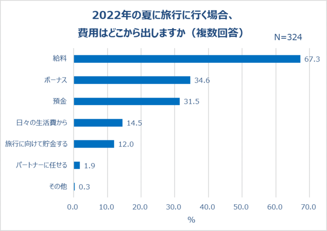 今年の夏、旅行に行く場合の予算は「30,000円以上50,000円未満(38.6%)」と回答した人が最多に。費用の出どころは「給料(67.3%)」が最も多く、日々の生活費を切り崩したり、旅行に向けて貯金をしたりする人は少ない結果となりました。また、多くの企業で6月に支給がある「ボーナス(34.6%)」にも一定数の回答が集まりました。