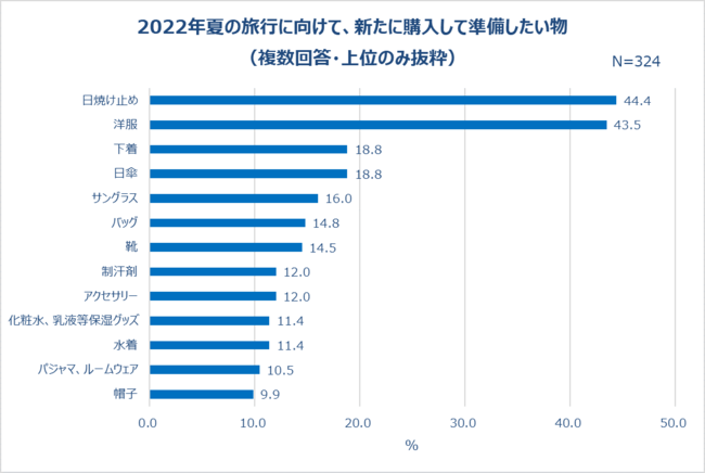 旅行に向けて新たに準備したい物「日焼け止め」「洋服」「下着」