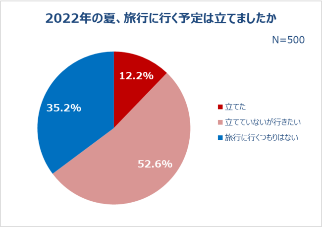 夏休みなど、長期休暇の機会に計画する人が多いと考えられる、旅行。12.2%の人が、既に旅行に行く予定を立てていました。「予定は立てていないが行きたい(52.6%)」と回答した人と合わせて6割以上が「旅行に行きたい」と考えていることが分かりました。