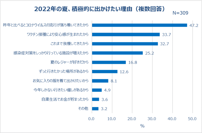 積極的に出かけたい理由としては「昨年と比べるとコロナウイルスの流行が落ち着いてきたから(47.2%)」「ワクチン接種により安心感が生まれたから(33.7%)」と回答した人が多く、現在の新型コロナウイルスの感染状況について、昨年と比べると安心感を覚えている人は増えていると考えられます。「これまで我慢してきたから(32.7%)」と回答した人も多く、昨年まで外出しにくかった分、今年は感染症対策を行いながらも外出を楽しみたいと考えている人は多いことがうかがえます。