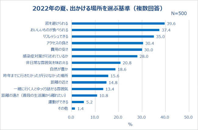 最後に出かける場所を選ぶ基準も聞いたところ、「密を避けられる(39.6%)」と回答した人が最も多い結果に。「感染症対策が行われているか(28.0%)」を重要視する人も見られます。2022年の夏はお出かけに前向きな女性が多いことが分かりましたが、可能な限り密を避け、感染リスクを下げられる場所を選びたいという意向も垣間見えました。
