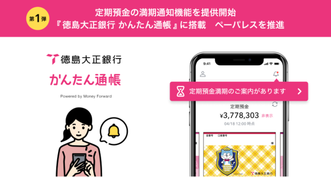 株式会社マネーフォワードは、『通帳アプリ』において「定期預金の満期通知機能」の提供を2022年5月23日より開始しました。第一弾として、当社が株式会社徳島大正銀行のお客さま向けに提供する通帳アプリ『徳島大正銀行 かんたん通帳』に「定期預金の満期通知機能」の搭載を開始しています。『徳島大正銀行 かんたん通帳』では、あわせて「無通帳申し込み機能」の搭載も開始しており、両機能は、徳島大正銀行のペーパレス推進およびコスト削減に寄与します。