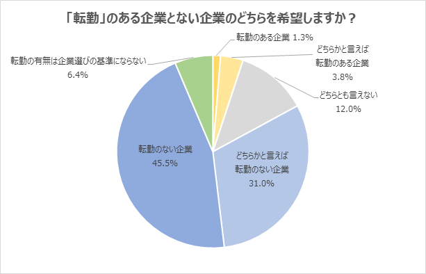 「『転勤』のある企業とない企業のどちらを希望しますか?」という質問において、「転勤のない企業」「どちらかと言えば転勤のない企業」と回答した20代が、8割に迫りました。「環境を変えたくない」「実家の近くに住みたい」「家族や友だちといつでも会える環境で生活したい」などの声が上がっています。「転勤のある企業」「どちらかと言えば転勤のある企業」と回答した20代は、5.1%に留まりました。「転勤」のある企業を希望すると回答した20代からは、「海外赴任を希望している」「若いうちは、様々な土地で仕事をしてみたい」などの声が寄せられています。