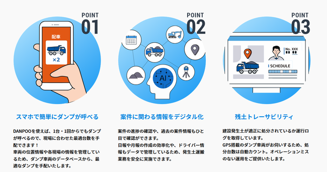 「DANPOO」は、必要な時に必要な回数だけ、1回の運搬単位でダンプを依頼することが可能な、ダンプのオンデマンド手配サービスです。これにより、一般的なダンプの契約形態である常傭(1日あたりの料金単位)では難しかった、刻一刻と変化する現場の状況に合わせた過不足無い手配が可能となり、発生土搬出業務の生産性向上、ひいては工期の縮減を実現することができます。また、依頼したダンプの運搬実績(現場や降ろし地への入退出記録や走行ルートなど)は自動で記録されるため、自社の動態管理ツールを導入することなく、建設発生土の追跡調査管理(トレーサビリティ)の対応が可能となります。