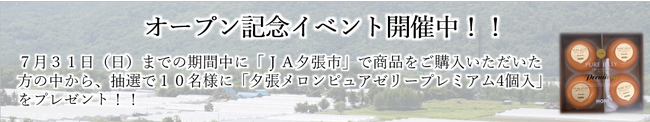 新ショップのオープンを記念して、6月1日(水)から7月31日(日)までの間、商品をご購入いただいた方の中から抽選で10名様に、「夕張メロンピュアゼリープレミアム4個入」をプレゼントします。
