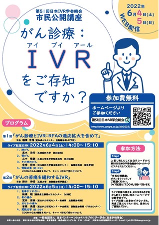 一般社団法人 日本インターベンショナルラジオロジー学会(日本IVR学会)(埼玉県東松山市 理事長 山門 亨一郎)は、第51回日本IVR学会総会の会期中、2022年6月4日・5日の2日間にわたり「がん診療:IVRをご存知ですか?」と題して市民公開講座を開催し、WEB配信いたします。