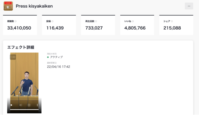弊社AR制作サービス『By AR』の実績として、弊社が制作したエフェクトの1つは、エフェクトを使った動画の視聴回数が1日で約1,300万回数という数値を出すことができました。また現在ではエフェクトの公開から約1か月ほどで3,300万視聴回数になっております 。(5/31現在)