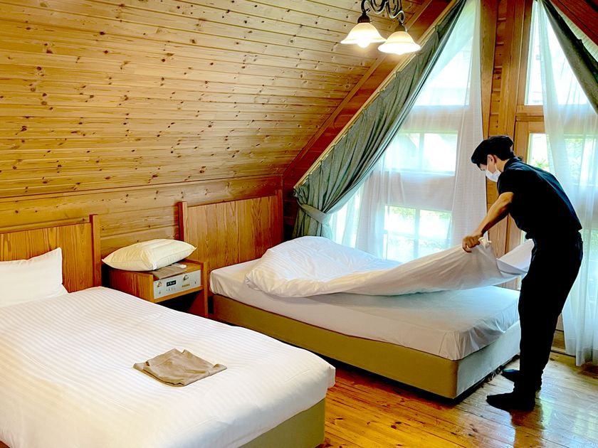 この度、ハウスキーピング業務を受託いたしました「ホテル・ロッジ舞洲」では、お部屋以外での多彩な過ごし方を楽しめ、一日の疲れを癒す空間づくりを進めておられ、ゆとりあるくつろぎの本館。自然との調和を体感できる別館「ネスト」。プライベートなひとときを過ごせるログハウス。個性豊かな3つの宿泊施設を広大な敷地内に有しておられます。