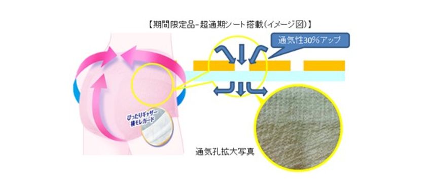・胴回りの不織布に「超通気シート」を搭載することによって通気性をアップしました。