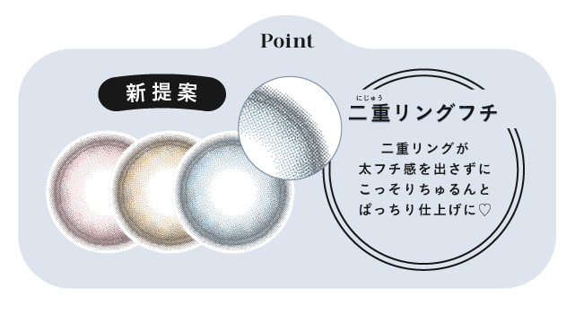 今回発売する3色の新色は細いフチが二重に重なった新提案の“二重リングフチ”で太フチ感を出さずに、こっそりちゅるんとした瞳を演出します。