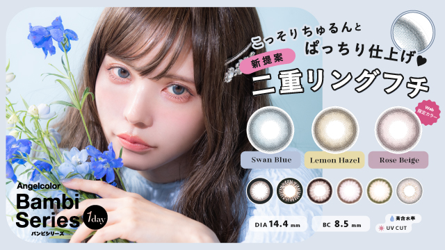 可愛らしいガーリーな印象になれる元祖「バンビシリーズワンデー」から、ほんわりちゅるとしながらも“毒っぽドーリー”な雰囲気になれる新色3色が登場。白っぽいブルーが瞳の透明感を引き出す「スワンブルー」。高発色でありながらツヤ感のある「レモンヘーゼル」に加え、WEB限定カラーの「ローズベージュ」が発売となり、新提案の“二重リングフチ”シリーズでさらに様々なシーンを楽しめるラインナップとなりました。