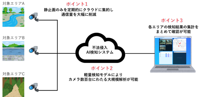 不法投棄・侵入監視システムは、下図に示すように各現場に設置されたカメラからの画像をクラウドに集約し、軽量かつ高精度なAIアルゴリズムにより人物の検知を行うことで、迅速な警告や統計分析などが可能となり、有効な不法投棄・侵入対策を講じることが可能となります。本システムで用いるカメラは、状況に応じた頻度で静止画をクラウドに送信することで、通信量を大幅に削減しつつ、機能上十分な検知の実現を可能にしました。また、軽量なAIアルゴリズムを用いることで、カメラ数百台規模での大規模処理も実現しています。