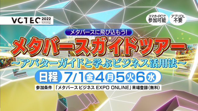 中京テレビ放送株式会社(本社:名古屋市中村区 代表取締役社長:丸山公夫)は、2022年7月1日(金)から開催されるビジネスフェス『VCTEC 2022』にて、アバターガイドと一緒にメタバースを体験しながらビジネス活用法を学ぶ「メタバースガイドツアー」の企画・制作協力をいたします。